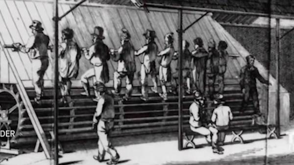 真相很残酷!当时跑步机是一种酷刑工具,一种强迫狱中犯人劳动的刑罚方式,犯人要不停地踩动辐条以带动巨大的桨轮,产生动力来碾磨谷物、抽水或是驱动磨坊,为政府创造收益。