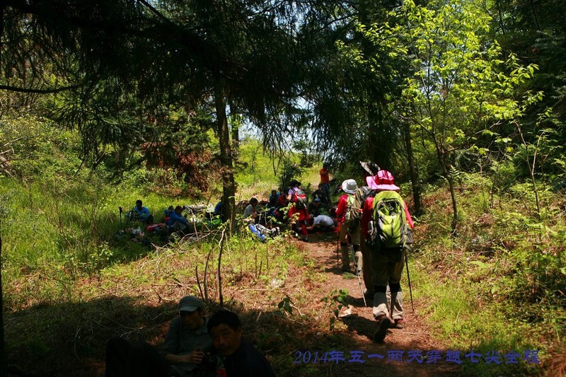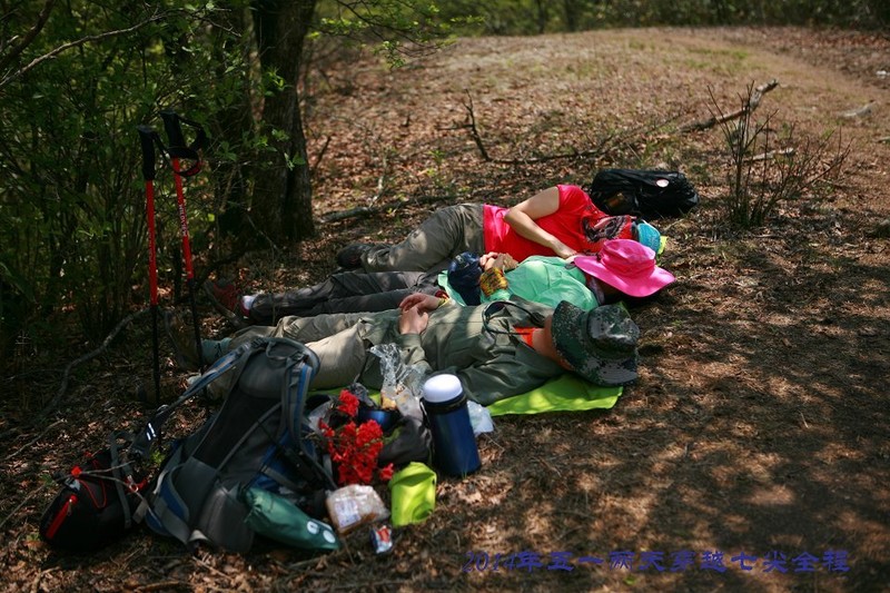 19日,6:30早餐,7:00左右开始登山,8:00至第一尖西天目仙人顶。 8:30沿仙人顶下防火线向北进发,11:00穿过密竹林灌木从至龙王山防火线、下包冲龙王山顶。11:00至第二尖龙王山顶。 12:00龙王山顶返回下包处、上包沿防火线向下进发,14:00翻过牛屎坡至第三尖药王峰顶。 15:00翻过几个小悬崖、石林到千亩峰下山谷、冲第四尖千亩峰。 15:30返回下包处沿小路横切向千亩田,经过火山口沼泽地至千亩田扎营或入住农家。 16:00向桐坑岗进发,16:30登顶第五尖桐坑岗。 17:00下至防火线与公路交叉处(移动发射塔),走几百米柏油路后转机耕路,10:00至深溪茅草山自然村。 17:30至檀树岗顶开始穿密竹林向仰天坪进发。登顶第六尖仰天坪,然后下山。返回农家,洗去一身的疲劳。晚上农家晚宴,篝火晚会,狂欢到入睡。 5月1日,早6:30早餐。7点车送登山口,到告岭,上椅子坪、大寮山、蓑衣塘、阳山坞岗、仙人台,(这段路全是密竹林灌木众)14:30登顶第七尖东天目大仙顶。 15:00从东天目景区下山,农家晚餐后,坐车回无锡。