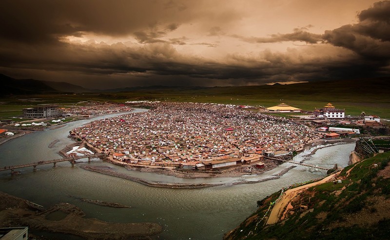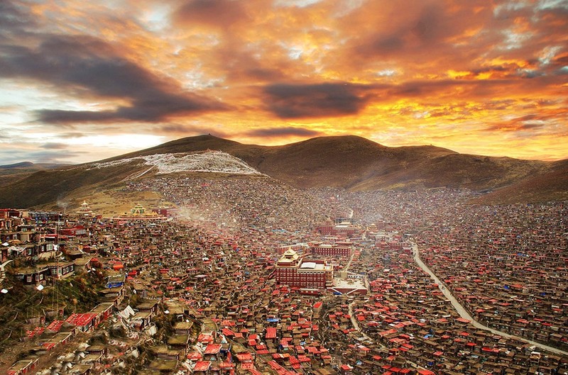 色达五明佛学院距色达县城20余公里有一条山沟叫喇荣沟,顺沟上行数里,蔚蓝苍穹之下,银岭碧草之间,数千间赫红色的木屋,如众星拱月般簇拥着几座金碧辉煌的大殿-它就是藏于深山中的喇荣寺五明佛学院,也称色达佛学院。色达佛学院是世界上最大的藏传佛学院。常住的喇嘛有两万多人。每遇有佛事活动人数还会增加,最多时可达四万多人。这里的僧舍很壮观,如果你是初次到色达,其庞大的阵势往往会让你目瞪口呆。连绵数公里的山谷布满了密密麻麻的小木棚屋,成千上万喇嘛和尼姑的宿舍,谷底和山梁上分布着几座寺庙和佛堂,建筑规模虽都不很大,但装饰考究而辉煌;身披桨红色僧袍的喇嘛和尼姑来来往往,空气中充满生机和祥和气氛。在佛学院最高的山峰上,有一个金碧辉煌的建筑,叫做“坛城”(音译)。它的上半部分是转经的地方,据说如果你有什么疾病,在这里转上一百圈就能够好;下面一层是转经筒,金色的圆筒在人们干枯的手转过之后留下一串悠长的嘎吱嘎吱的响声。色达喇荣寺五明佛学院,是世界上最大的藏传佛学院。常住的学员有两万多人。每遇有佛事活动人数还会增加,最多时可达四万多人。堪称“东方耶路撒冷”。